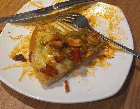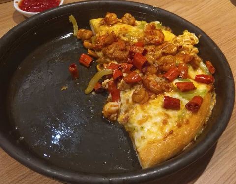 ...慢了,吃的东西味道还可以,点餐没有用机器还是人工手写,吃的小龙虾披萨上图给大家看看,材料太少了