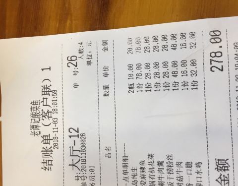 最后买单,发现酸菜鱼是78块钱一份的,算账的时候会减免,就是赠送的。其它的菜性价比蛮高的,也不怎么贵