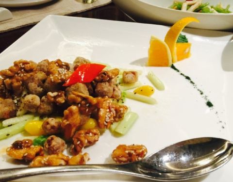 琥珀鹅肝核桃比较好吃酥脆,鹅肝裹了东西,炸过像豆腐泡一样,细品有肝丁。脱骨鸭掌味道不错