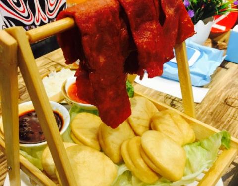 这家店在河东万达金街,新开不久,从星巴克一侧往里走到头一左拐就到了,店内装潢很有特点,墙上画的狼,与店面相切合。可以堂食,也可以外卖,主打特色的酱骨头,4,9一块,可以麻辣,也可以五香。17元套餐太超值了,米饭和酱骨头的量很大,而且酱骨头不是非常咸,肉质多,菜肴是香橙冬瓜,超级入味,甜脆口味。店家服务热心,每个桌子上都配有餐巾纸和一次性手套,方便手拿大骨头啃。这家餐厅还经营炒菜和盖饭类,下次要来品尝锅包肉,嘿嘿。