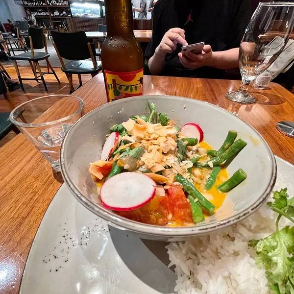 新开的店,人不多。店铺简洁装饰,很过瘾。服务生热情介绍各类优惠活动。泰式红咖喱牛肉配黑米,5点后6折。泰式的酸酸的汤,牛肉切细条,量不大蛮酥软的,黑米硬硬的不易消化。能量充电站,藜麦,甘蓝,红豆,芋...