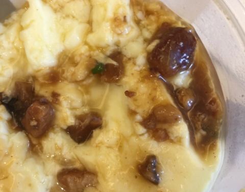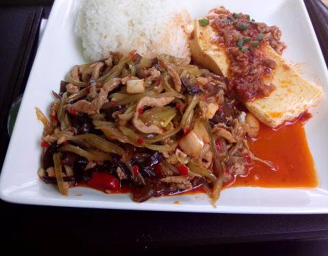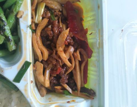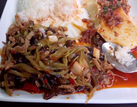哇,9块钱一份的炒豆干居然翻出了两片肉!!!太意外了!!!还翻出了一根毛!!!最后实在舍不得吃这两片肉,拍张照片纪念一下!这份16元的饭我一定是花了一半的钱买空调清凉费的!
