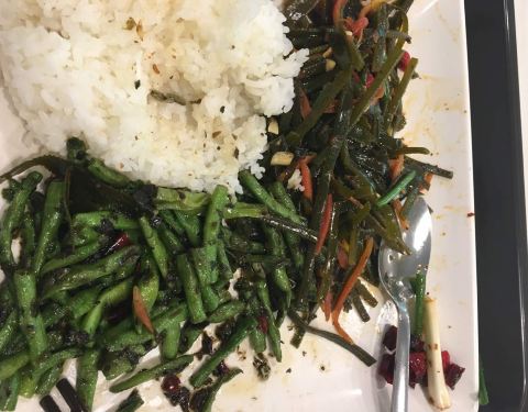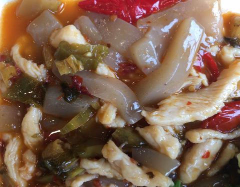 魔芋炒鸡丝味道不错,酸菜口味的,开胃!炒白菜口感硬,像不太熟,而且有点怎么会是苦的?