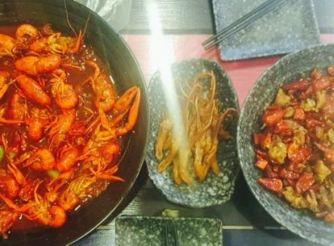 刚下车,来到这里,感觉好饿,看见了龙虾盖饭,就进去品尝,犹豫来的挺晚的,就随意点了点吃的,朋友说辣子鸡好吃,就点了。青菜上菜速度很快,辣子鸡就有些慢,或许是做法比较麻烦,辣子鸡味道还不错,就是放了...