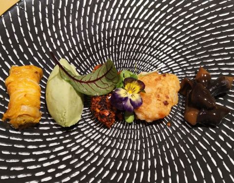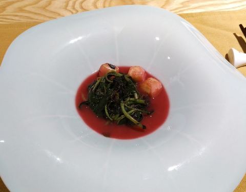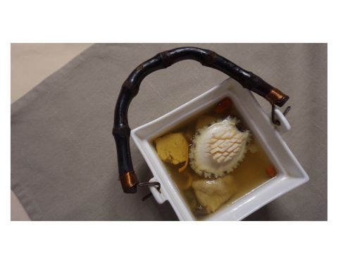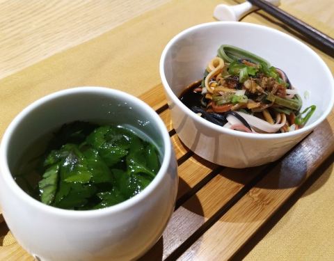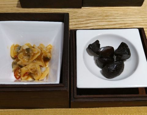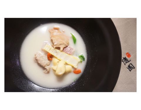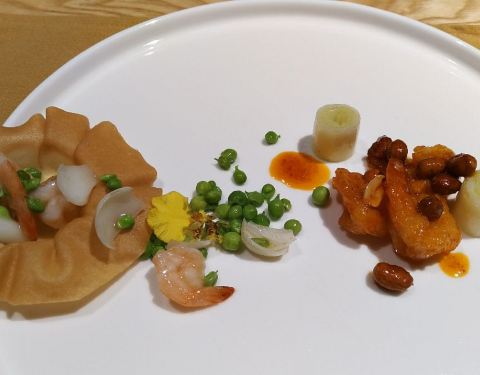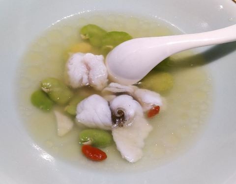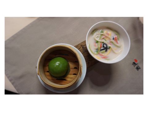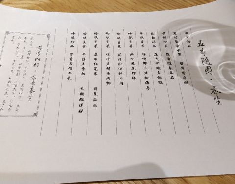 五季,取自春、夏、长夏、秋、冬五个季节,对应五行和人体五脏。 随园,取自袁枚致仕后归隐的南京小苍山随园。 五季随园将清朝美食家袁枚《随园食单》中的100多道菜肴,顺应《黄帝内经》养生的理念,加以挖掘和整理。 调味两品:蚬肉,黑蒜头。 黑蒜头是将新鲜的生蒜,带皮放在高温高湿的发酵箱里发酵60~90 天,让其自然发酵制成的食品。 应时餐前水果:提子 红心火龙果 奇异果 凤梨 蜜瓜,品质都很好,甘甜。 翡翠香米湖:菊花脑熬制,菊花脑有着特殊气味和吃下去的微微清凉感受,清热降火、 前调冷菜 - 随园迎客五味:印象比较深刻的就是牛油果,挖开牛油果,三文鱼 牛油果块 桑葚包裹其中。 悠韵汤品 - 石斛山珍草鸡大连鲍:石斛 枸杞 虫草花 松茸 草鸡 大连鲍鱼,汤清味鲜。 菁华招牌 - 蒋侍郎三丝烩海参,最爱的一道菜,海参清爽弹牙,春笋丝、香菇丝鲜嫩爽滑。 吟赋主菜 - 黑蒜醋汁菇香雪花牛肉,中西结合的做法,牛肉的肉质很好,口感自然不会差。 虹鳟鱼籽翡翠芙蓉鱼片:想到了京苏大菜中的清炖鸡孚,鱼片洁白如雪,软糯可口,荠菜的加入平添了一丝春意,春天食用荠菜,应时而食,可以驱邪明目,吉祥而健身。 春笋蚌仔腌笃鲜:“腌”,指腌制的咸肉;“鲜”,指鲜肉;“笃”,就是用小火焖的意思。春笋和河蚌、咸五花肉片,再加上百叶结一起炖煮。看似漫不经心,实则肉的酥肥醇厚与的笋清香脆嫩相得益彰,妙不可言。 野芦蒿春韭螺丝头:清明螺,赛只鹅,春韭初割,与螺肉同炒,是春天的一道时令菜。好吃且下饭! 芦蒿又称蓬蒿、蒿菜、桐花菜,芦蒿有蒿之清气、菊之甘香,吃出清甜的感觉。 鱼汤五季面:想到了东台鱼汤面,手工制作的蔬菜面,口感很筋道,鱼汤奶白又带着浓厚鱼味。 蛋黄肉松青团子:青团油绿如玉,糯韧绵软,清香扑鼻,肥而不腴,颇具一番风味,咬一口就是春天! 吟赋甜品 百香果假牛乳:牛乳者非牛奶,是奶酪也。虽曰假,确以假托真与奶酪神形兼备,又白又嫩又细腻,洁白嫩滑、香甜醇厚,与百香果搭配,两个字完美。天然皂角吹成的七彩泡泡,一戳即破,煞是有趣! 皂角 ,又名皂角树,是我国特有的苏木科皂荚属树种之一。皂荚果是医药食品、保健品、化妆品及洗涤用品的天然原料。 《随园食单》杂牲单:用鸡蛋清拌蜜酒酿,打掇入化,上锅蒸之。以嫩腻为主。火候迟便老,蛋清太多亦老。