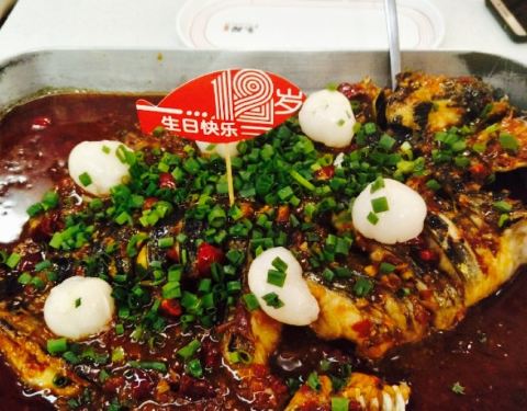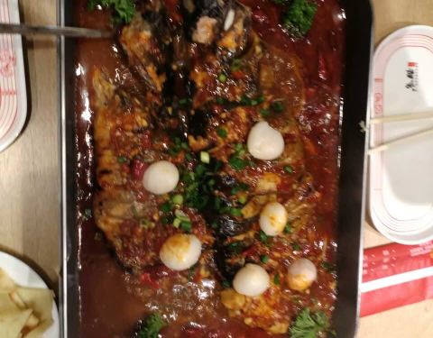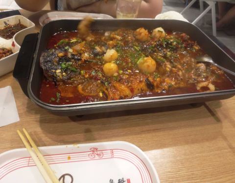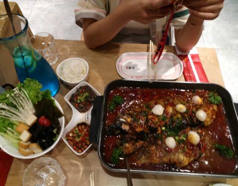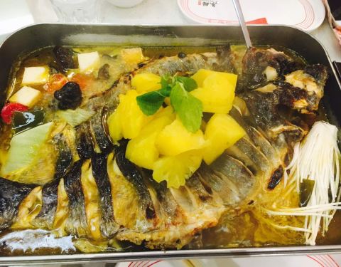 说实话,鱼的口味一般,口味自己选,鱼自己选,水果烤鱼其实就是在烤鱼上放了一层水果,还是水果罐头,特别甜。毕竟鱼是现杀的,肉质比较嫩,吃到最后,煮的比较老了,很有嚼劲。说一下服务吧,服务员的水平真是...说实话,鱼的口味一般,口味自己选,鱼自己选,水果烤鱼其实就是在烤鱼上放了一层水果,还是水果罐头,特别甜。毕竟鱼是现杀的,肉质比较嫩,吃到最后,煮的比较老了,很有嚼劲。说一下服务吧,服务员的水平真是有待提高,很没有眼力见,这里地方很小,椅子很小,桌子也大多是两人桌,餐具还是要收费的,。对了选鱼的时候说是有草鱼、黑鱼、清江鱼可选,说是2-3斤,实际去选的时候只有清江鱼可选了,而且基本都是两斤半以上的,这么大的鱼两个吃正好,会有一点点剩。恩,这次的体验真是一般般