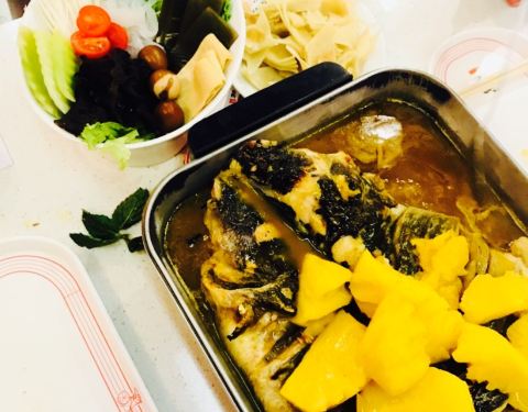 说实话,鱼的口味一般,口味自己选,鱼自己选,水果烤鱼其实就是在烤鱼上放了一层水果,还是水果罐头,特别甜。毕竟鱼是现杀的,肉质比较嫩,吃到最后,煮的比较老了,很有嚼劲。说一下服务吧,服务员的水平真是有待提高,很没有眼力见,这里地方很小,椅子很小,桌子也大多是两人桌,餐具还是要收费的,。对了选鱼的时候说是有草鱼、黑鱼、清江鱼可选,说是2-3斤,实际去选的时候只有清江鱼可选了,而且基本都是两斤半以上的,这么大的鱼两个吃正好,会有一点点剩。恩,这次的体验真是一般般