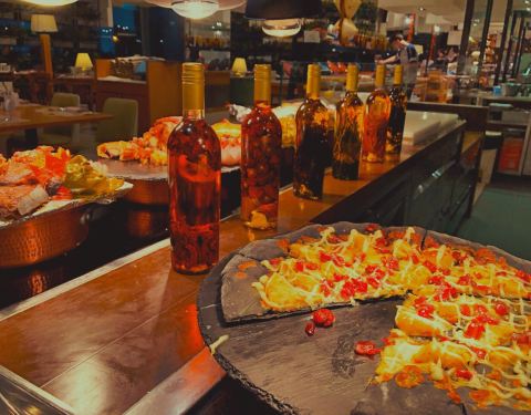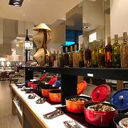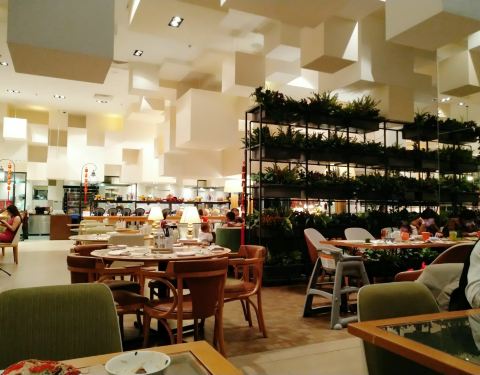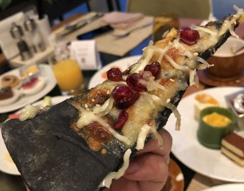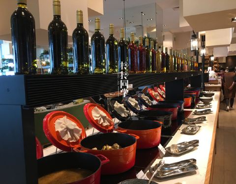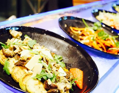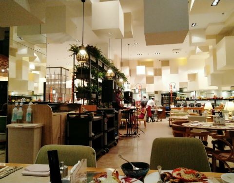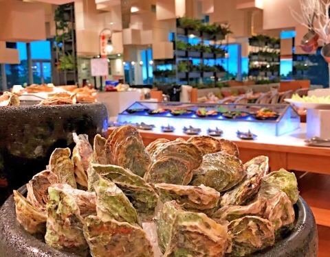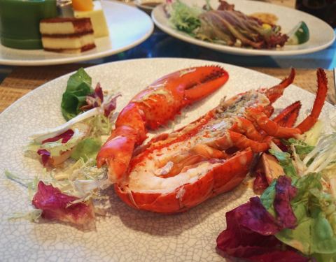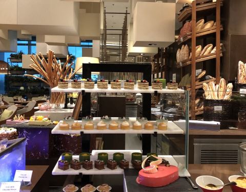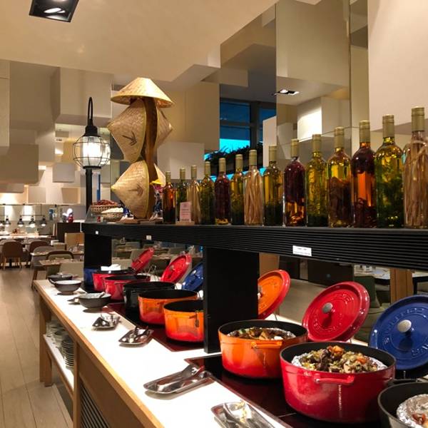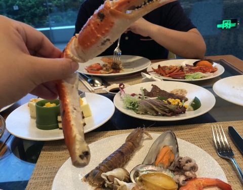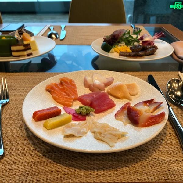 推薦:进大堂左边就是馨石堂自助餐厅,进去首先选了一个靠窗的位置,刚好台风天,外面的天空颜色很特别。随后去挑了自己喜欢食材~食物的摆放分为甜品区,饮料区,水果区,这三个连在一起;生鱼片和寿司;中间长条分布着凉菜沙拉区、海鲜区、熟食区~与次并列的是烧烤区、披萨区、面档区、煲汤区、主食区等。非常丰富的食材,所以要好好享受香格里拉的自助餐