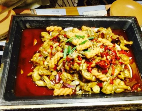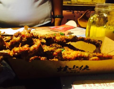 说实话,一开始我是被这名字吸引的,这么侠情仗义的名字,美味,我要去看看,( ̄▽ ̄,)。 。 。 。地址,正义坊北馆二楼(扶梯旁就是)。 。 。 。环境,有酒吧风格,灯光比酒吧亮,隔墙有种神秘感,加上餐具,还有点像生活在古代感觉(沉浸在美食不能自拔,忘拍了)。 。 。 。 。美味,蛙小侠,主要来了,本人比较喜欢青椒紫苏味和苗家酸汤味的牛蛙,喜欢偏辣的可以选择麻辣味的。小吃推荐烤牛蛙,十里香排骨,爽口鱼皮,臭豆腐,去骨黑凤爪,烤茄子,烤牛蛙真的很香,配料好,烤出来的色相也棒,十里香排骨是大猪肉的,咬下,那劲,好爽,好香。冷饮,推荐金桔乳酸菌,淡淡的奶香,喝着不会感觉很甜或很酸,中等,很冰爽。 。 。PS,牛蛙是一种高蛋白,低脂肪,低胆固醇的健康食品,帅哥美女们都大胆放心去吧。