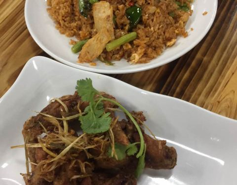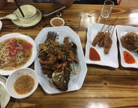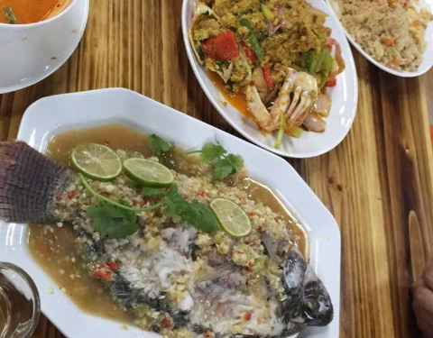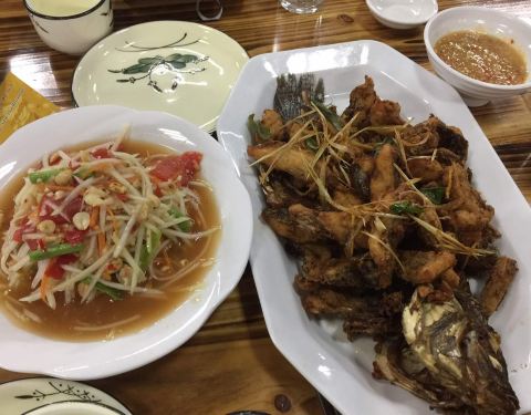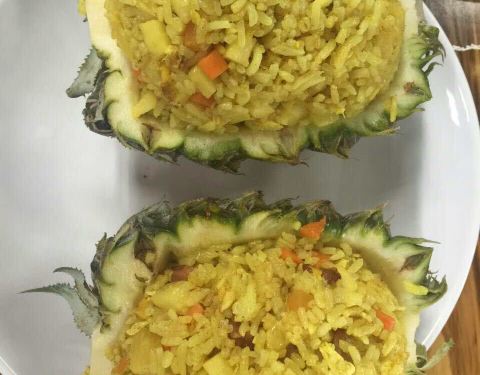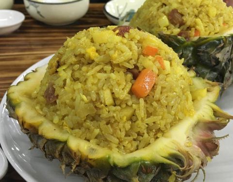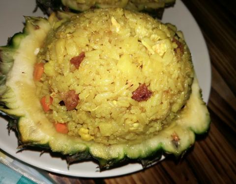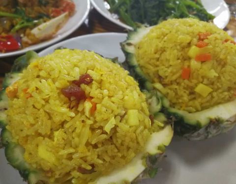 - 还行,菠萝炒饭比较有泰国风味。柠檬鱼,青椒的味道比较重一些,微酸。木瓜沙拉,里面有炒花生
