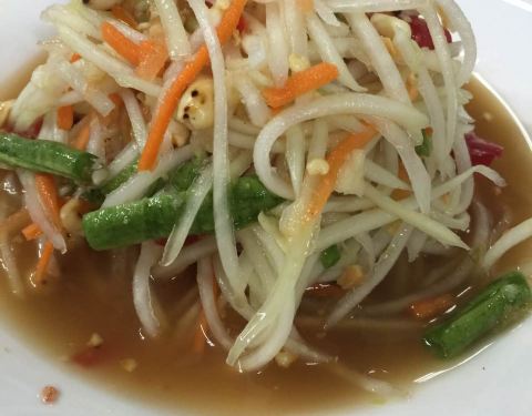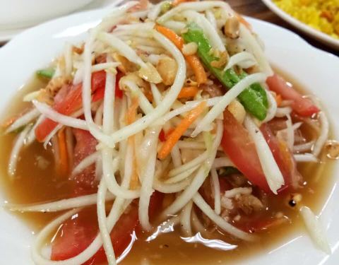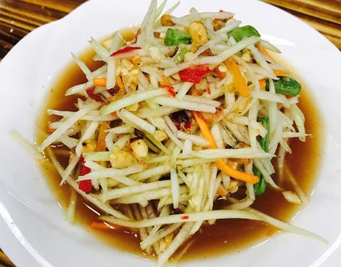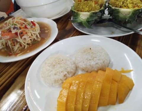 还行,菠萝炒饭比较有泰国风味。柠檬鱼,青椒的味道比较重一些,微酸。木瓜沙拉,里面有炒花生