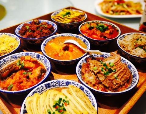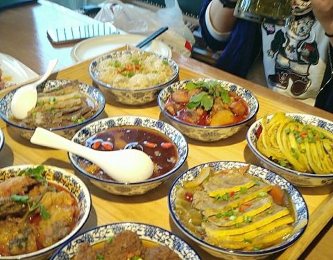 第一次去乌鲁木齐吃的第一顿饭,有民族特色。那个拌面有点酸辣口感很好,花卷加了当地类似胡椒粉的调料有种非常的酒香,九大碗中有,3碗是不同做法的牛肉丸子,味道还行吧,一个牛肉蛮可口的,鱼块味道一般,中间的甜点是糯米红枣9碗中最美味的。第五张图片忘了菜的名字,是鸡蛋皮夹了牛肉未在油锅里炸一下,比较有特点。鱼的做法类似松鼠鳜鱼,应该是草鱼,味道还行吧。店里环境安逸,服务态度好。
