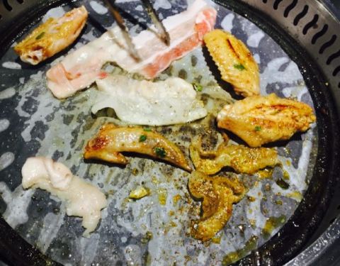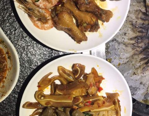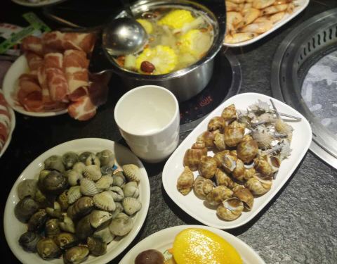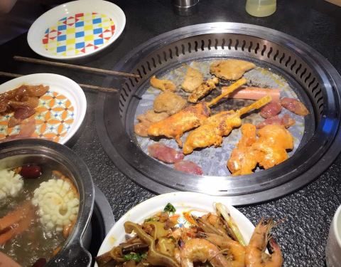 牛哥俩在义乌之心六楼,由于上次去人太多没吃成,今日总算吃上了。服务员领我们进里面的位置子,发现里面的地面有点滑,穿拖鞋要特别小心。坐下我们就各自拿自己喜欢的东西,首是拿一些熟食垫一下肚子,再拿一些烤的肉,还有一个小火锅。即可以烤又可以吃火锅,这样可以多重选择。菜品还可以,看起来也比较清新,水果都是拿完就马上补给。还有很多我比较喜欢小吃麻球等等。还小孩比较喜欢吃烤串烤生蚝都有。冰淇淋饮料种类挺多的,还有一些甜点,吃好以后如果是光盘还可以抽奖哦,奖项挺多。
