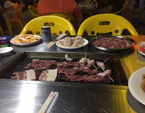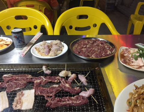 以后去民生夜市那家吃。那家比较好吃。老板也好讲。这边老板是几个女人婆。吃几百。连个两块钱零头都不少。心凉。这么热的天。还是别吃烤肉了。没空调。热死你