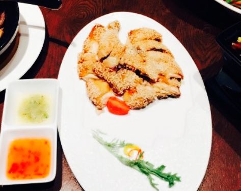 请朋友吃饭,没好意思照相。下午四五点左右可以预定,它们家给保留到18,30,这个服务挺好的。最怕火的饭店你能预定。我们六点半到那,给安排到落地窗的位置,还可以看到外面的夜景。菠萝包,榴莲酥,虾饺必点,只可惜晚上不能点肠粉,肠粉只供中午有。深井烧鹅沾酱很美味。石锅豆花鱼,鱼肉,豆腐特别嫩,有些麻。很入味。芝麻鸡就一般了,本人不高兴。有个红烧的鸡爪,忘记叫什么名字了,味道很好。炒牛河一般,没有什么风味。芥蓝有点老。