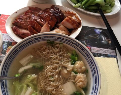 这家是正宗的广东人开的烧腊饭店。叉烧,烧鸭,烧肉之类的烧腊做的很好吃。而且点菜送饭,量都超大,根本不需要再点主食。我比较喜欢云吞面配烧腊,所以我还点了云吞面。不过云吞面的味道很一般。因为云吞和面都不是新鲜的纯手工做的,而是冰冻的那种,所以口感不好。国外蔬菜你就更别指望新鲜了。这家店开在唐人街上,当地华人和老外来吃饭的很多。没看见什么旅游团来吃饭。小店不大,按照中国晚饭时间六点去基本有位子。七点半之后就坐满了。