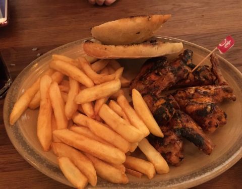 英国的连锁鸡店。发小她快餐必吃榜第一名,也是她朋友绝对不吃榜第一名…… 喜欢吃鸡的我觉得还不错,值得吃,便宜大腿很满足。 特色是有各种酱料,各种辣度,最喜欢柠檬酱,酸酸的,恨不得每一块都蘸满酱。 忘了这碗叫什么了,好像鸡杂之类的……像一碗,卤,对,超级咸,就着面包吃,又甜又咸的那种好吃。 还有薯条超好吃。 几乎坐满,黑人朋友居多,几乎每桌都有,价格实惠。