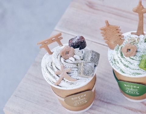 在清水寺整片町家建筑中,ROCCA 的店面相当独特,颇有设计感的货车,坐落在怀旧的八坂通上。穿着和服的妹子,络绎不绝地来打卡。招牌Dessert Latte独一无二,以京都地标景点为造型的cookie做点缀,分别有八坂塔、京都塔、鸟居和大文字。真是有超高的辨识度!Dessert Latte的奶油会有些腻,但普通的Latte也相当有水准,还有各款日本茶。
