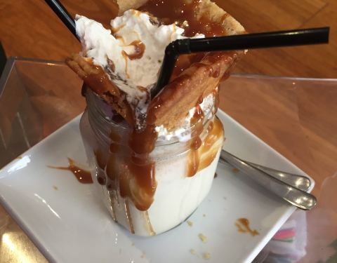 Indulge and go for a frankenshake. Hidden away from main street view, and only 3 tables, but delicious gelato and pretty good coffee too. This pic is of the cookie crumble.
