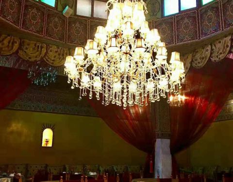 这家餐厅,经营中东地区的特色食物。各种繁琐的图案,颜色厚重的门帘。还有五层的大吊灯