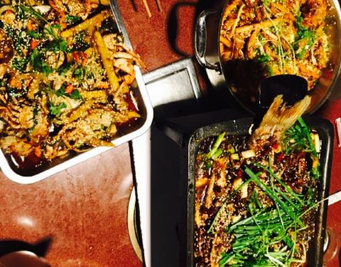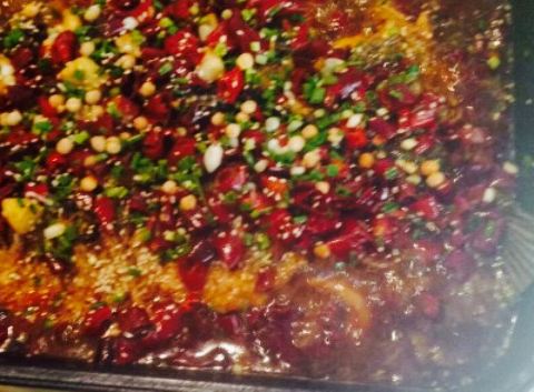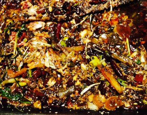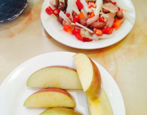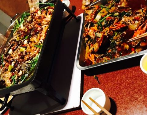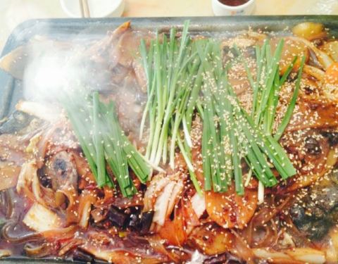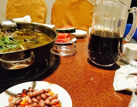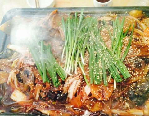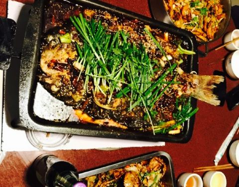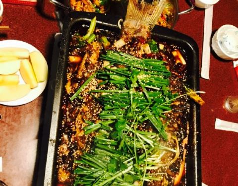 点的烤鱼,很鲜美。这儿有免费苹果和泡菜,苹果很甜很脆,泡菜也比四川好吃呢。味道还不错,吃了几盘泡花生米。最好喝的酸梅汤,是老板娘自己熬的汤,非常好喝,非常健康。值得推荐的一家店^0^,我们三个人直接喝了两壶,最后还问老板买一壶,女老板人非常好,直接送了一壶。