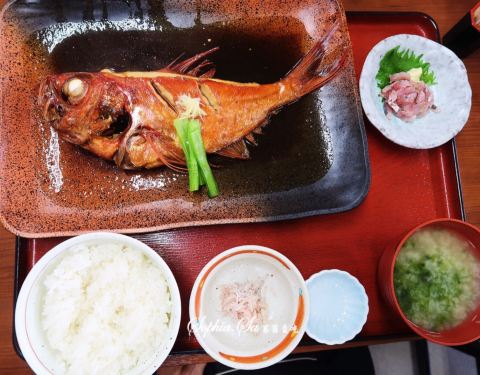 来到伊豆半岛的下田市,如果刚在港口乘坐完黑船,那很推荐来这间装修简朴的“金目亭食堂”用餐,营业时间是早上7点到9点30,中午11点到下午3点,新鲜的鱼获餐厅只做早饭和午饭,门口有类似拉面的售票机,选好自己餐后直接投币买票就可以进内堂等待。 伊豆盛产金目鲷和小龙虾(伊势海老),其中组合长套餐包含了有半只龙虾的味增汤,金目鲷刺身前菜,刺身拼盘,金目鲷刺身饭,和金目鲷煮。由于金目鲷和龙虾都是非常贵的食材,2900日元的性价比超出我的想象。2月特别适合吃金目鲷,这个季节油脂含量适中,肉质滑而细腻,刺身的新鲜在于放进口腔内,舌头能感受到鱼肉的温度,完全没有急冻处理,刺身肉质爽脆,油脂略少不肥腻。金目鲷煮是用用糖,清酒,酱油炖煮,味道略甜,煮熟后鱼鲛位置的肉质稍硬,但是另外1800日元原条金目鲷煮套餐内的金目鲷大概一斤左右,幼鱼的肉质很细腻嫩滑,好吃得只能筷子不停。还有一款杂锦海鲜丼饭套餐同样1800日元,最适合爱刺身人群,但是如果食量够大,还是推荐2900的组合长料理,约170元人民币的价格,能尝到鲜甜的龙虾,贵价食材金目鲷刺身和煮物,性价比太高了。