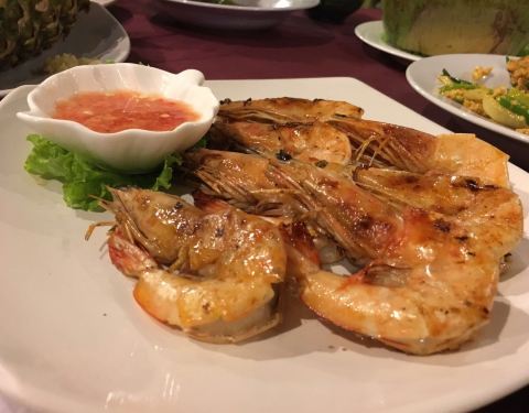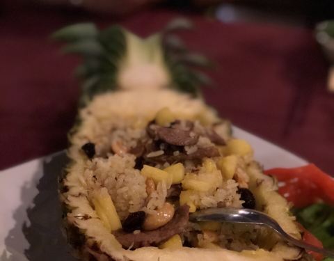 误打误撞入的店,没想到口味还不错。推荐冬阴功汤,应该是改良版的,没这么重口味,关键是装在椰壳里的,椰香味更佳浓郁! 四人点了咖喱螃蟹,烤虾,空心菜,柠檬鱼,冬阴功汤,菠萝炒饭和4杯饮料,共计1250铢,超高性价比了!