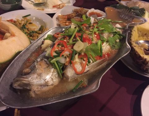 四人点了咖喱螃蟹,烤虾,空心菜,柠檬鱼,冬阴功汤,菠萝炒饭和4杯饮料,共计1250铢,超高性价比了