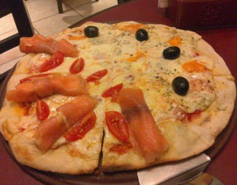 Pedi uma pizza com queijo brie, presunto cru e tomate seco, mas não foi uma boa pedida. O presunto estava grosso, com muita gordura e salgado demais.