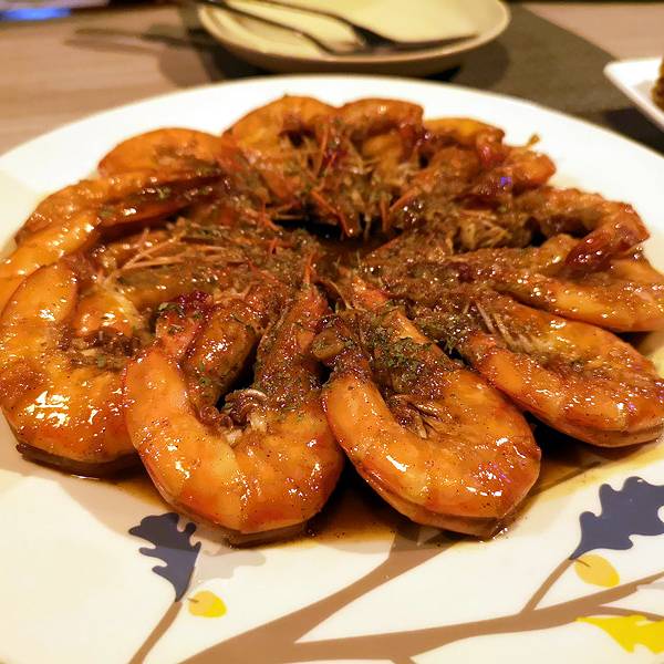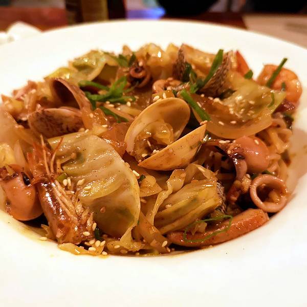 饭点排队的人非常多。海鲜炒面 有点辣,但是超级好吃的。蜂蜜蒜香明虾一定要尝尝,份量比较大,不用点太多