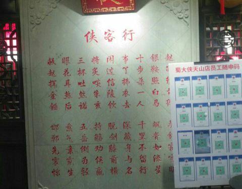 环境:蜀大侠里进门就见侠客行,望着店内红灯笼、长条凳清水砖有点意思。耳边回荡着《沧海一声笑》的背景音乐非常应景就马上联想到江湖。什么是江湖?人即是江湖。什么是江湖?恩怨即是江湖。江湖是美丽的,在深...