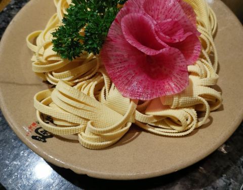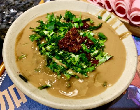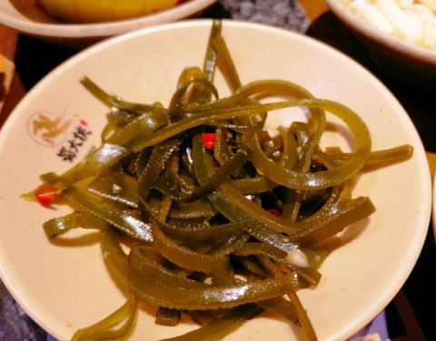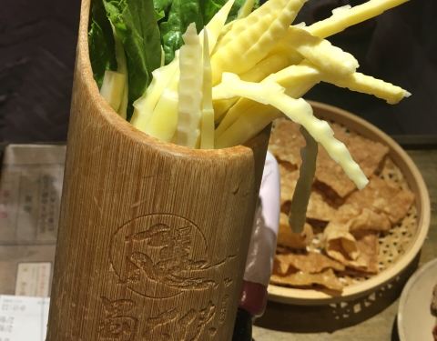中午人不多,一共六七桌吧,门口没有迎宾,全靠自己进去找座。 上菜很快,自助小料也很丰富。 美中不足就是锅底实在太咸了,捞出来就能吃,啥也不用蘸也很咸。 熊猫竹笋也没有可爱的熊猫容器了,变成了一个毫无特色到笔筒。 厚百叶和海带芽分量很足。