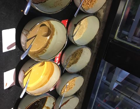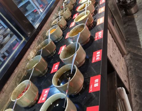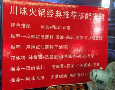 - |蘸料^店家非常贴心的在自助调料台贴出了川味火锅经典推荐搭配酱料表,懒人族可以按图索骥按需自...