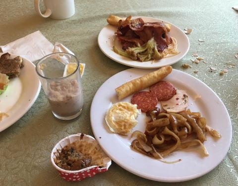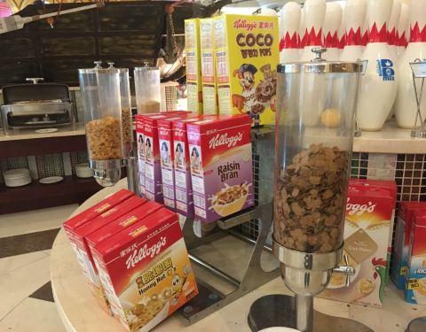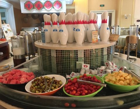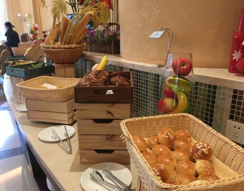 入住的酒店包含了早餐,7点到10点,用餐时间还是嘿广泛,九点半才下来吃,菜品依然是嘿丰富,中西餐合并,自助式个人选,夹了个培根鸡蛋吐司,配甜甜圈牛奶,一碗米粉个人搭的佐料,味道还不错,吃得嘿饱。