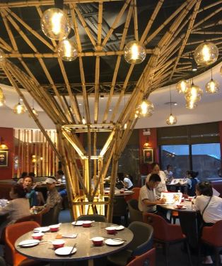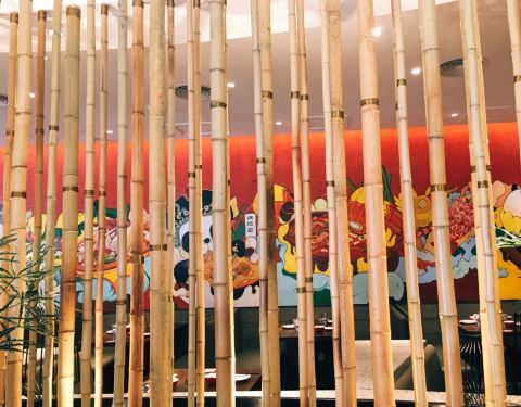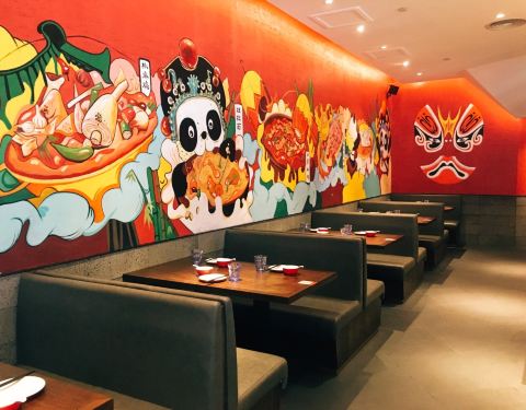 新开的餐厅环境自然很好,干净整洁,同时川系脸谱、辣椒、熊猫壁画穿越期间,加之竹子的隔挡,十分热情欢乐