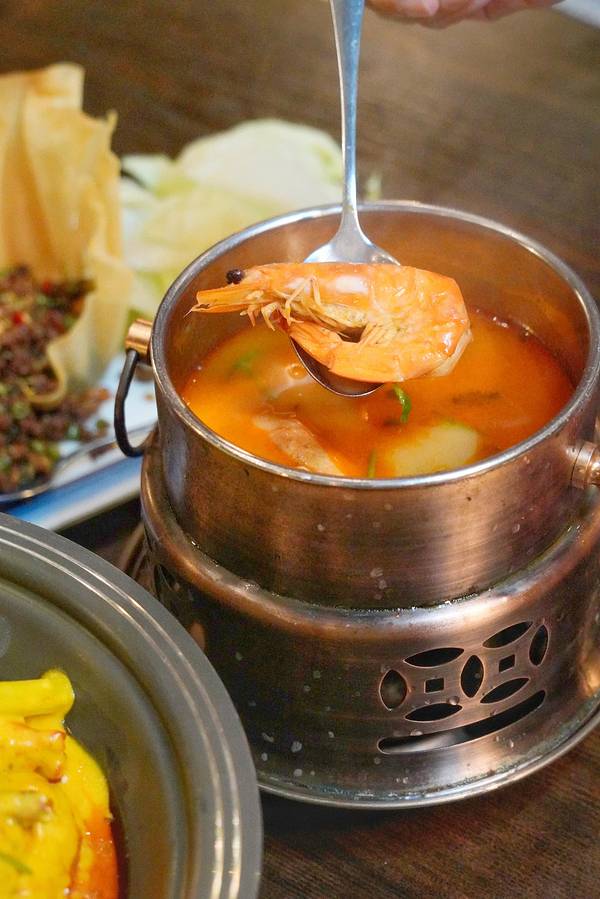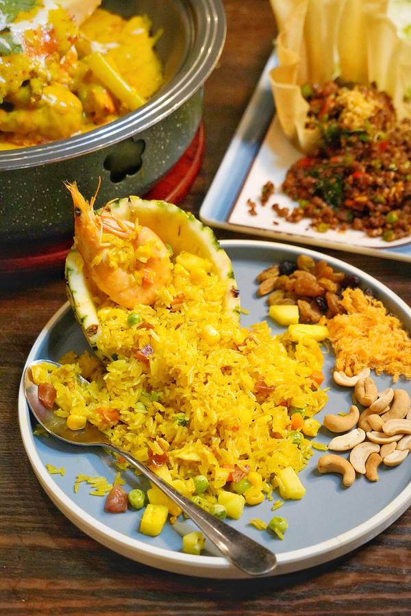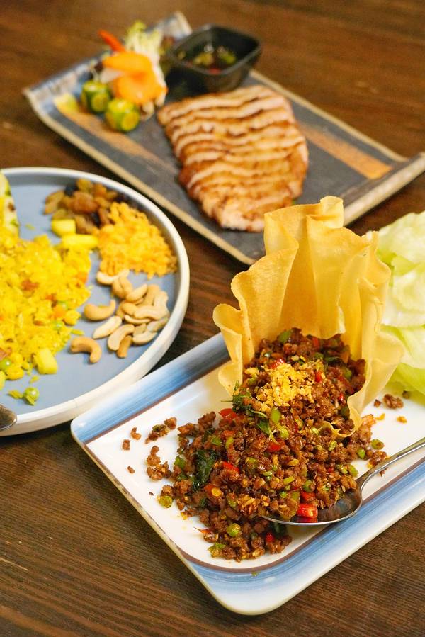 海鲜吃够了,换一下口味,挑了一家泰菜“泰越轩”,吃了冬荫功汤和咖喱蟹,解锁了新菜式。泰式冬阴功虾汤,非常地道的冬阴功汤,很开胃,喜欢的话可以自己学着做这道菜,我就跑去泰国学过,但是不操练也忘得快呀...海鲜吃够了,换一下口味,挑了一家泰菜“泰越轩”,吃了冬荫功汤和咖喱蟹,解锁了新菜式。泰式冬阴功虾汤,非常地道的冬阴功汤,很开胃,喜欢的话可以自己学着做这道菜,我就跑去泰国学过,但是不操练也忘得快呀!好开胃的咖喱蟹!泰国北部小吃,这里一款用手抓的小吃,用鱼腥草叶子包起柠檬、腰果、小米辣、虾米干、洋葱、特制酱料等,一口吃,味道很棒,吃完之后,口里还有回甘,忍不住再做下一个继续,非常喜欢这款,这是第一次吃,我就喜欢上它了,隆重推荐给你们。泰式碎牛肉生菜包/牛肉碎,这道菜和韩国菜M比较相似,但使用的圆生菜叶可是大小一致,码得整整齐齐,生菜也和牛肉碎各自单吃都不怎么好吃,但是用生菜叶包着牛肉碎再入口,那可就不一样了,清甜脆的生菜和干巴的牛肉碎相结合,入口咔嚓一声,在口中咀嚼,相互融合的味道堪称完美。招牌菠萝海鲜炒饭,推荐点一个当主食,我一直都很中意吃菠萝海鲜炒饭,每一个元素都是我喜欢,酸酸甜甜的菠萝粒,美味的虾仁,加了咖喱的米饭,散散的一粒一粒的,好味道。泰式明炉烧猪颈肉,肥瘦皆有的猪颈肉是我非常喜欢的食材,烧出来的真是香喷喷,肥而不腻,配上绿咖喱和蔬菜沙拉,一道泰式美味。泰式红珍珠,一个超好喝的甜品。餐厅环境:泰越轩面积不是特别大,但处处很精致,泰式风情浓厚,饭店时间座无虚席,顾客全都安安静静用餐,无人喧哗,交谈也是压低声音的,这儿不乏国际游客,不好说泰菜比海南菜更受外果仁欢迎,只能说泰越轩的菜水平卓越!【美食攻略】