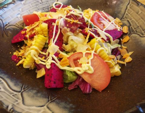 烤三文鱼头推荐,新鲜,肉质香嫩。有机沙拉里面水果品质不错