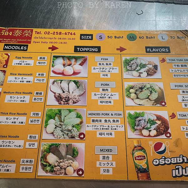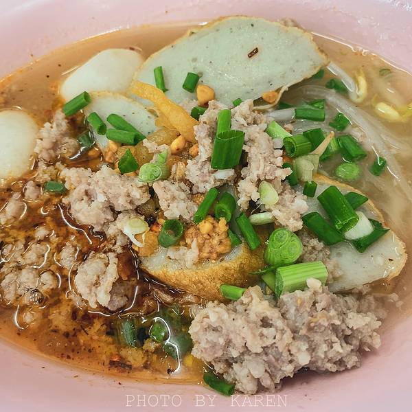 来之前看了白大叔的《街头美食斗士》曼谷篇,其中有一幕是一碗美味到溢出屏幕的猪肉粿条汤。我就这样被种草了这家店——泰荣。在遍地都是米其林的曼谷,泰荣是家鼎鼎有名的老字号猪肉粿条店,只需要花11元就能吃到的米其林小吃,讲道理谁不爱! 泰荣从营业到现在已有近60年历史了,几乎每天都是客流不断。尽管有人称泰荣,也有人称荣泰,也不阻碍它的人气和知名度。反正找准位置,来吃就对了!店内环境很简单,典型的大排档式,位置也很随意只要有位就拼桌。每张桌上都放有调料,有鱼露、辣椒粉、白糖、花生粉、辣椒醋、柠檬、胡椒粉等,非常人性化,口味任君调配!关于点餐,菜单是中英泰日韩五国语言,没有语言障碍,怎么点也是一目了然! 第一步:选面。蛋面、米粉、粿条、河粉、粉丝、尖米粉。粿条是招牌必点,也就是我们所说的米粉。 第二步:选配料。鱼丸+鱼饼、猪肉、猪肉末+鱼丸+鱼饼、混合。照菜单推荐的点准没错! 第三步:选汤底。干拌酸辣、清汤、酸辣汤。 第四步:选分量。分量分成S\M\L,价钱各为50铢、60铢、70铢。 个人建议:如果想要尝试其它口味的,可以点S或M的分量就好。我们点的两份都是招牌推荐,清汤的猪头粿条(混合),酸辣的猪肉粿条。虽然小小的一份,但是配料很足。混合的有猪肝、猪肉末、鱼丸鱼饼等,鱼丸弹牙,猪肝鲜嫩,而且还有配豆芽在里面,汤底也是超级鲜美。酸辣的也很符合我的口味,可以适当加些泰式调料来提味,又是另一种风味。 炸鱼皮,是店内的招牌小吃,听说是当日限量的。炸鱼皮在泰国是很受欢迎的一种零食,鱼皮被炸得酥酥脆脆,一口一个就跟薯片一样。加了辣椒粉的也很好吃。哈哈,我在荣泰又点了龙眼水,也是这家的必点哦!☆店名:泰荣 📍地址:10/3 Sukhumvit Soi 26, Sukhumvit Road, Bangkok, Thailand 🚇交通:搭BTS至Phrom Phong Station,4号出口,步行约5分钟即抵达 ⏰营业时间:每天8:00-16:30 💰人均:11rmb ✔️必点:猪肉粿条汤、炸鱼皮、龙眼水