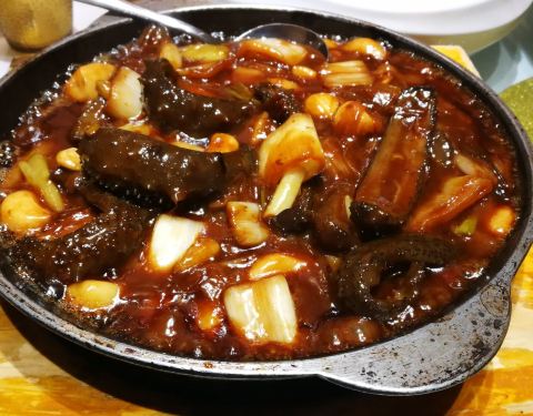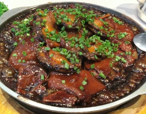 - 特别是葱烧海参和亿家红烧肉连续端上来吓坏了俺,而且前面还有个鲍鱼煨猪手,后面又是个亿家花雕鸡和腌笃鲜
