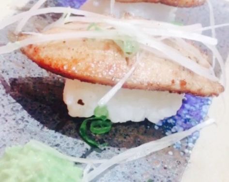 在广州吃过的鸟剑,偶然发现在东门新开了一家,果断去尝试。店家正在试营业中,刚开张还不到十天,所以店里还没什么人也比较僻静,反正店里的氛围就是很适合三五好友一起喝酒聊聊天,或是自己来喝点小酒放松下心情,店里有吧台,榻榻米,普通座位三种,也很适合拍照。位置,尽管不在大路边上,但也不难找,跟着导航就能到,门口依旧是小小一个,进来以后却别有洞天。食品。海鲜沙律,茶泡饭,烤物都口感清爽,值得推荐给大家,特别是茶泡饭,有好几种口味可供选择,才20元一份,这个性价比挺值得一试的,烤物方面梅子鸡胸肉(图4)吃起来会比较特别,觉得是之前没吃过的味道,但又谜之鲜美。唯一有点失望的是因为好奇点下的烤饭团,有两种口味酱油味和味噌味可供选择,点的是味噌口味,我以为是整个饭团都会有味儿,但结果饭团不小,只有表面的有味儿,中间部分没什么味儿,有些失望。还有芝士鸡蛋卷的分量有些小。饮品的话店里有各种啤酒清酒,但这次去没喝酒,点了一杯可尔必思,也还挺不错喝。服务。可能日料店的服务员都会非常特别的客气。反正服务确实很不错。