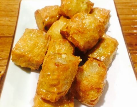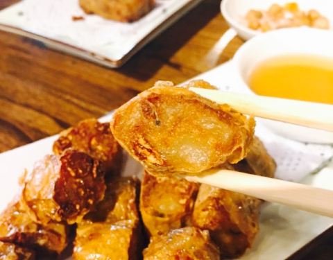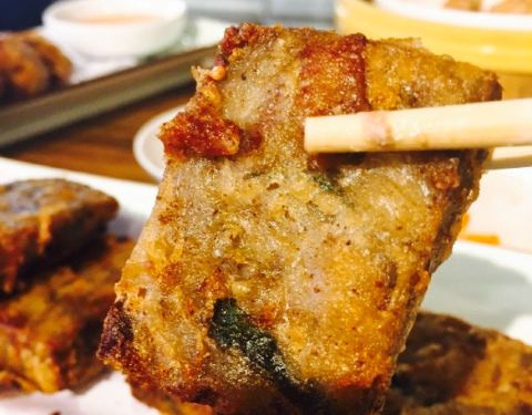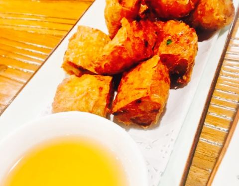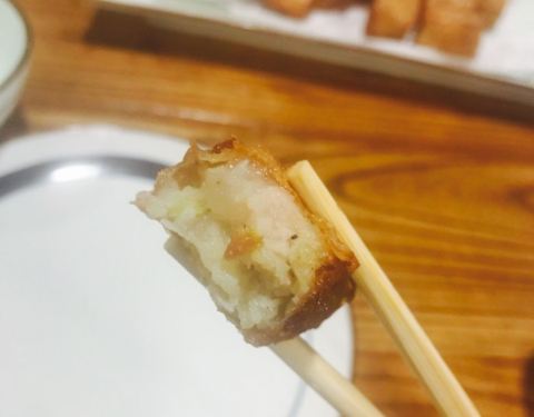 - ✨P3#炸潮汕粿条#,内馅儿有猪肉,马蹄和虾肉,蘸酱略甜,香,不过略油。并且是满满的一层