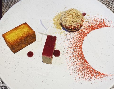 【口味】「勃艮第红酒炖牛肉」土豆炖牛肉的感觉,味道还是很的,牛肉很软,肉确不散,小土豆也很软,还有骨髓,味道很好「法国布列塔尼蓝龙虾」味道很好,四块龙虾很精致「加拿大扇贝(4年生长期)」扇贝个头很大,配了面筋和米粉,很有中式吃法的感觉「鹅肝三重奏」有鹅肝慕斯,还有底层配有鹅肝酱的类似饼干的食品,味道都不错,鹅肝慕斯更是很醇厚的口感「法式传统千层酥」甜品,千层酥配冰激淋「餐前面包」有两种,一种全麦,一种普通,配着「自制黄油」味道还是很不错的「土豆红虾」很好吃,算是酒店送餐前小菜,味道很精致 【环境】[薄荷]环境: 很小的店 【服务】[服务铃]服务: 还可以,法餐的节奏,服务员会介绍每道菜品