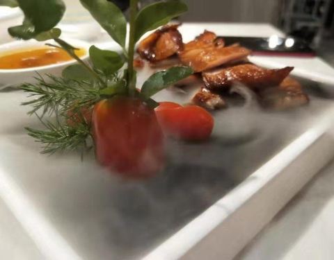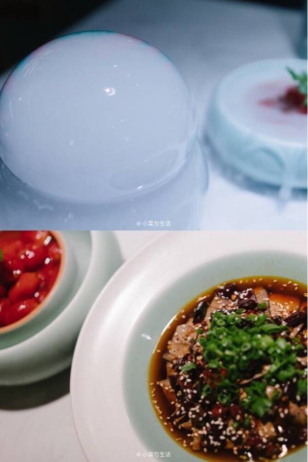 2⃣️加勒比海蜇:相当精致的一道菜,仙气缭绕,服务员还会拉一个大泡,相当惊艳,待白烟渐渐散去,才看清里面是什么。