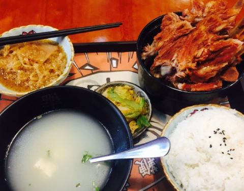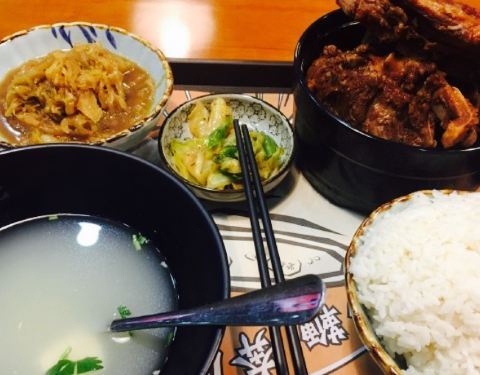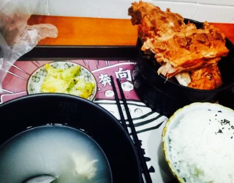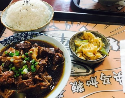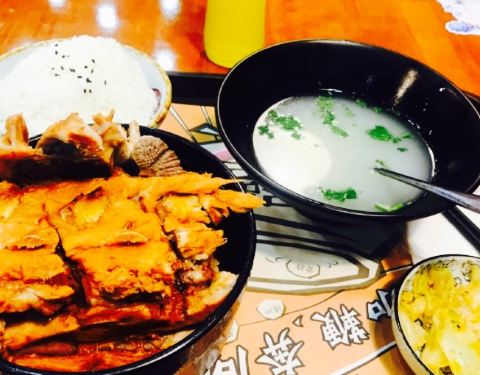 听我们同事说这家不错,心水了许久,今天带她拔草啦。店家不大,不过装修风格还不错,都是动漫人物,比较年轻化,虽然小店不大,不过人还是超级多的,犟骨头饭是招牌,吃的人不少,还会发手套,不过我觉得炖的并不烂,比较难啃,排骨饭还可以,可是也不是纯排,牛腩饭挺不错,筋头巴脑的,不会很瘦,下饭好吃。还有送一碗汤。