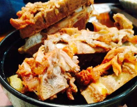 一直听说万达开了犟骨头,朋友说巨好吃,就过来尝试,点的招牌的犟骨头套餐,29一份,一份犟骨头4大块,女生绝对吃不完,特鲜美而且软烂脱骨,脊骨上的骨髓也是棒棒的,酸菜炖的太烂了,而且好油,单买的话好像6元,套餐里还包括一碗汤,一碗白米饭和一小碟咸菜。本人认为就骨头味道而言完全可以给满分了,但是感觉这种主菜应该至少配几个清爽一点的小青菜什么的就完美了。商家不大,随时准备排队和拼桌。