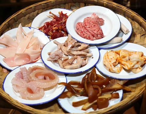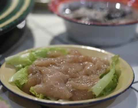 烟熏鸭脯,光这份量给价格就已经很让人震撼了,9元/份的价格。如果单位聚餐人多的话,绝对值得每桌直接点上三份。况且还是烟熏过的鸭脯肉,更是值得期待的美食。朋友夹起一片还一本正经以专家的身份给我们介绍如何看待这家的烟熏鸭脯,比如这家的这盘颜色很正道,每一片上面的水份有烟熏,但是又把握的恰到好处,没有完全水份,每一片肥厚但是又不是很腻人,柔嫩柔软的口感,如果有一天酱汁吃起来会更舒服。 毛肚,如果说吃火锅对毛肚的理解,我觉得我可以算是一个地道的吃货。这份毛肚端上来就感受到了温度,几片毛肚加一碗冰水将每一片毛肚的口感保持的很专一的清脆。并且每一片上面挂的冰水给人的视觉感都是晶莹剔透的感觉,这种感觉,时时刻刻都在向人传递新鲜,新鲜。夹起一片烫好的毛肚,放在香油的料碟里面,哇,好清脆的感觉。 嫩脆鸡肉片,这道菜是每一次吃火锅喜欢点的菜,不管是在这一家还是在其他火锅店,因为始终觉得鸡片给人的第一感觉都是很健康。有时候甚至吃鸡片都能一个人吃完一份。而这一家的鸡片特色更是突出有味。一份切的很薄很薄的鸡片首先让我承担了帮大家煮和捞的这个工作,滑嫩再加上有一点点脆的口感让我们沉醉于这份鸡片上,完全吃不下去后面其他菜品了。 鸭肠,划重点写,8元/份,对于喜欢吃脆爽菜品的我们来说,在感受了毛肚的极致口感之后赶紧又开始鸭肠之旅。吃鸭肠对于吃货来说有两种感觉是最难以忘记,一是吃的时候认真的听声音,咯吱咯吱咯吱的声音有没有是对鸭肠品质最好的诠释。二是入口的那一口是不是一口就可以搞定,如果还要多嚼二下的情况下,说明这个毛肚真不是那么巴适。谢谢这家的老板,做出了让我既可以听声又可以享受清脆的内涵。