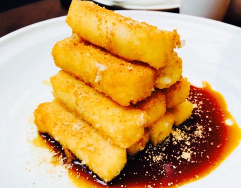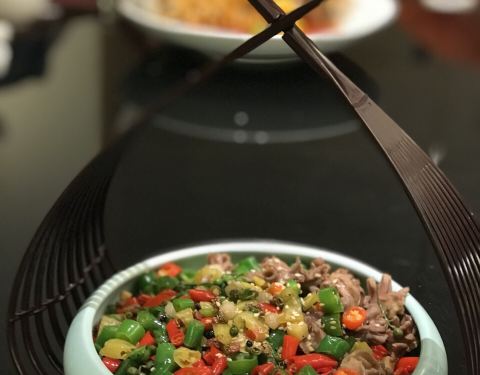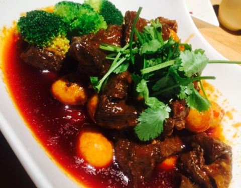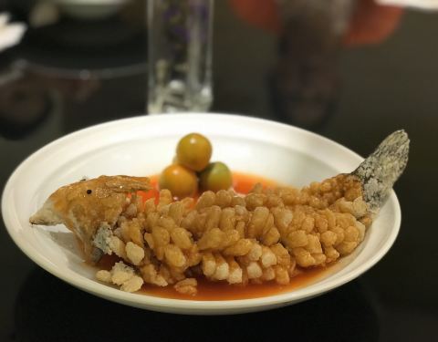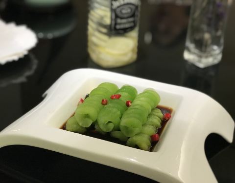 高大上的重庆天地,朋友带路过来见世面(捂脸),各种有格调的食堂,眼花缭乱,最后选定这家开业不久的融合菜,一眼看中的环境,玻璃房,简洁风,室内外都可以落座,晚上天气好在室外落座很有调调。位置醒目,在电梯旁边,鲨鱼餐厅隔壁。难得遇到的满分餐厅,有颜值有内涵??桌距很大,私密性不错,适合约会聊天。店员态度很好,主动告知菜分量足,不要点多浪费,加水应答都很快,有菜品售罄,老板娘还亲自出来道歉btw老板颜值好高??。豆筋棍烧猪尾,很接地气的菜品,猪尾软糯,满满的胶原蛋白,粘嘴巴,豆筋棍浸入肉汁,十分爽口,米饭杀手。牙签牛肉,难得在这种环境下吃到大排档的味道,牛肉选材上乘,没得筋头,火候正好,肉质不柴,入味足。松鼠鲈鱼,第一次吃鲈鱼做的松鼠鱼,肉质细腻,几乎无刺,它家酱汁比较特别,番茄味突出,回味一点甜,多吃几口都不会腻,一个人干掉大半条。虾饺皇,口感饱满,三只虾应该有的,鲜甜弹牙,水晶皮略厚,还好没影响口感,有广东早茶的9分神韵。