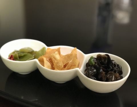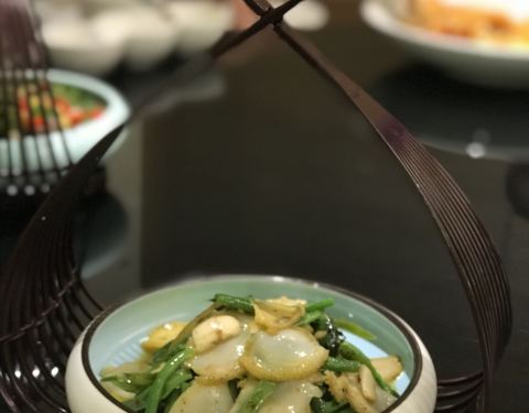 這間店人氣很旺, 有兩次我們在樓上喝完茶準備下去吃晚飯, 都被告知已滿座需要長時間等待。 所以在母親節的中午請父母們吃飯, 通過大眾點評做了預訂, 順利預訂了一間包房。 餐廳裝修很有格調, 簡潔清新, 很適合朋友家人間的聚會。 有些菜式的設計的確是第一次遇見, 比如切割得像螺絲一樣的萵筍頭, 比如燒椒豇豆伴的切片兒的鮮鮑, 味道真是不錯。 鴿胗的口感也很脆嫩, 倒是咖喱蟹顯得平平, 不如隔壁家的。 當天的服務有些問題, 服務員態度雖然很好, 但客人太多出菜慢且混亂, 毫無順序可言, 最後還少了一個鵝肝醬焗蘑菇。 大廳會顯得很嘈雜, 鄰桌間彼此乾擾很大, 包房隔音還行, 若非一定要去玻璃房自拍, 還是建議包房合適。 大眾點評的優惠券不能累加使用, 800多的消費只能用一張折扣券, 優惠12元, 的確沒什麼意思。