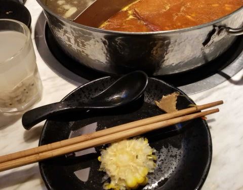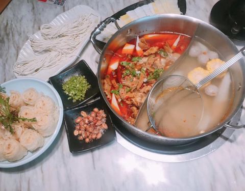 工作日中午过来吃的,11点多点到店的,不用排队!坐下没多久,外面就开始排起长队了! 【鲜牛杂鸳鸯锅】牛杂很香,煮的糯烂,上桌先吃牛杂,吃的差不多服务员回过来加汤!加了汤之后,都没辣味了~ 【牛肉丸】潮汕火锅,最好吃的要数手打牛肉丸了,他家的也不错!很有韧性! 【脆毛肚】毛肚不够脆,没有主打毛肚的火锅店好吃额! 【匙炳?】应该是吧?个人觉得还是五花腱比较好吃点,肥瘦相间! 【青梅竹马】青梅加马蹄的搭配,很怪异,有点甜了~ 【银耳】放在火锅里很特别,口感还不错,可以尝试! 尴尬,尴尬,竟然没有炸腐皮,不开心,不开心! 服务挺好!总体还不错!