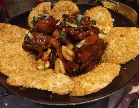 地锅小公鸡:很硬克的一道菜,饼满满的芝麻很好吃,微微甜口的鸡肉软烂入味